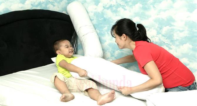 Di Tempat Tidur.Ide bermain: “Laju Perahuku” – Ajak balita di atas guling, minta dia menggerakkan kedua tangan untuk ‘mendayung’ seperti saat berperahu. Goyangkan tubuh ke kiri dan ke kanan, kadang-kadang berteriak, “Awas ombak besar! Basah, deh!” Bisa juga katakan, “Sssstt, pelan-pelan mendayungnya, di sana ada ikan duyung sedang bermain. Halo ikan duyung, numpang lewat ya…”