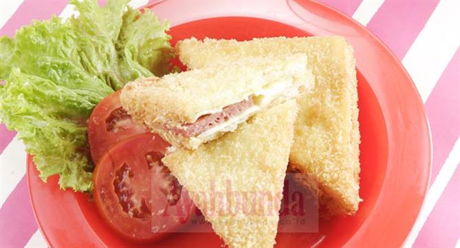 1. Oleslembaran roti tawar dengan margarin, letakkan selembar keju, satudaging burger, dan selembar keju di tengah roti, lalu tutup denganselembar roti lagi. Masing-masing roti yang sudah diberi isi, dipotongdiagonal menjadi dua bagian.