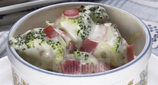 2. Campur brokoli, sup, susu formula dan daging asap dalam mangkuk. Aduk rata. Pindahkan ke dalam loyang persegi.